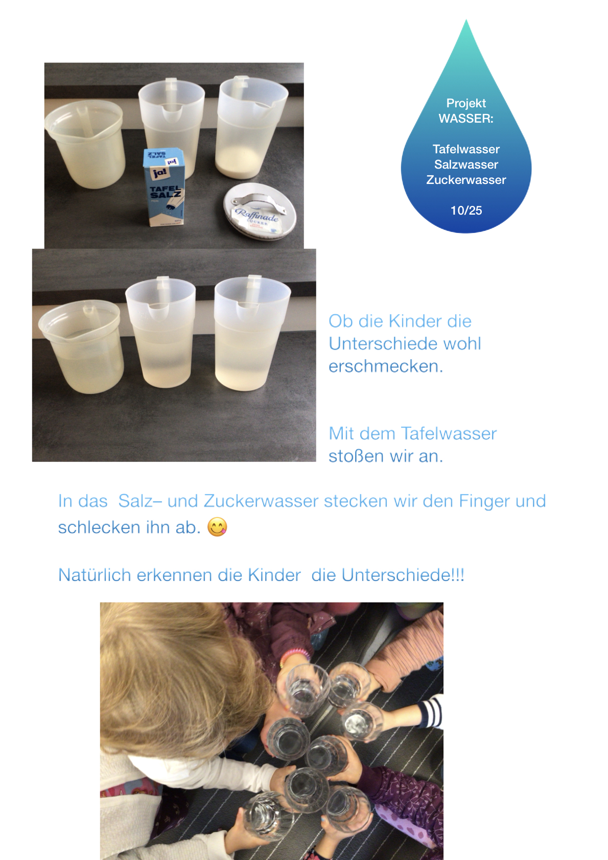 Zum Model Wasser haben die Kinder ein Experiment mit Tafelwasser, Salzwasser und Zuckerwasser durchgeführt!